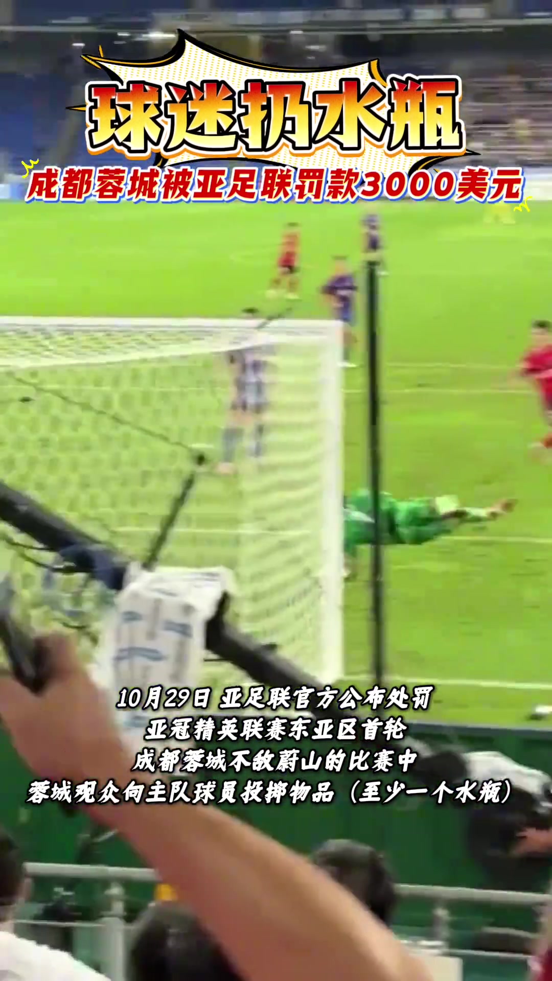 成都蓉城球迷亚冠客场观赛扔水瓶!俱乐部被亚足联罚款