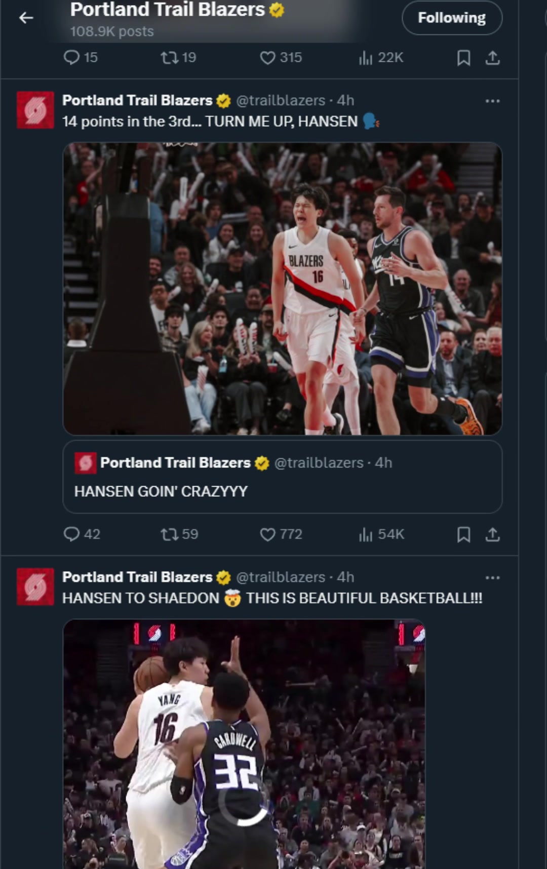 中国力量!开拓者官方连续发布8条推特,盛赞杨瀚森精彩表现