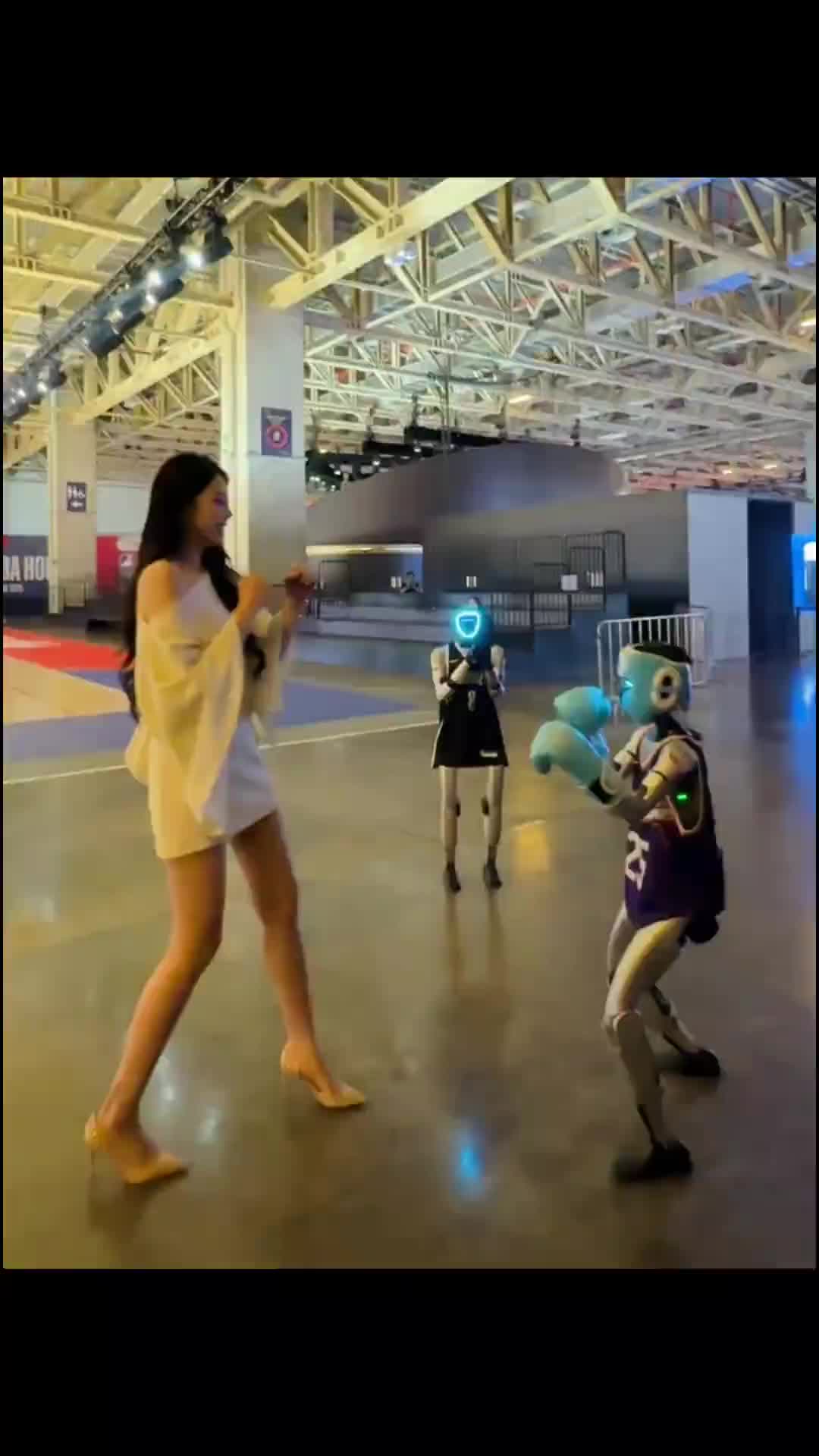 这腿是真长啊!女主播小太阳在中国赛场馆内和机器人打拳击~
