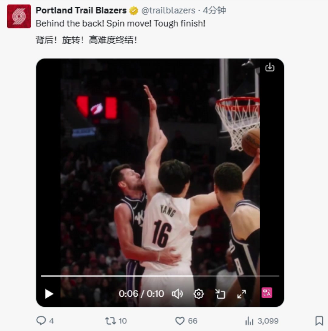 给予肯定!开拓者官推晒杨瀚森背运过人上篮:高难度终结!